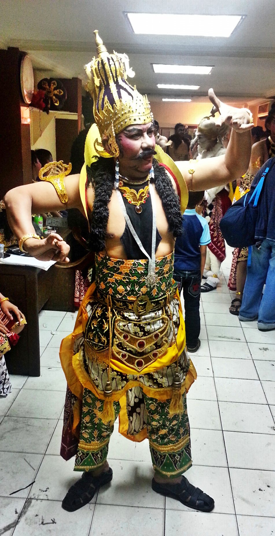Saya bertemu dengan penari senior, Pak Tyo. Setelah ngobrol, beliau mempersilahkan kami untuk melihat bagaimana mereka mempersiapkan diri dibalik layar.