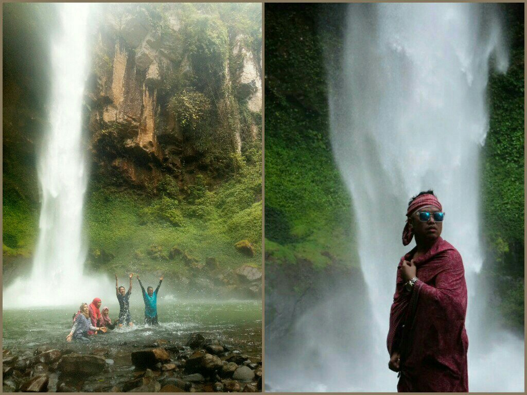 Saya memilih untuk mendekat ke sungai yang terbentuk di kaki air terjun. Menonton teman-teman yang menceburkan diri ke sungai dan bidadara turun dari Khayangan untuk berfoto di kaki Putri Malu lengkap beserta Juru potret dan pengarah gaya-nya.