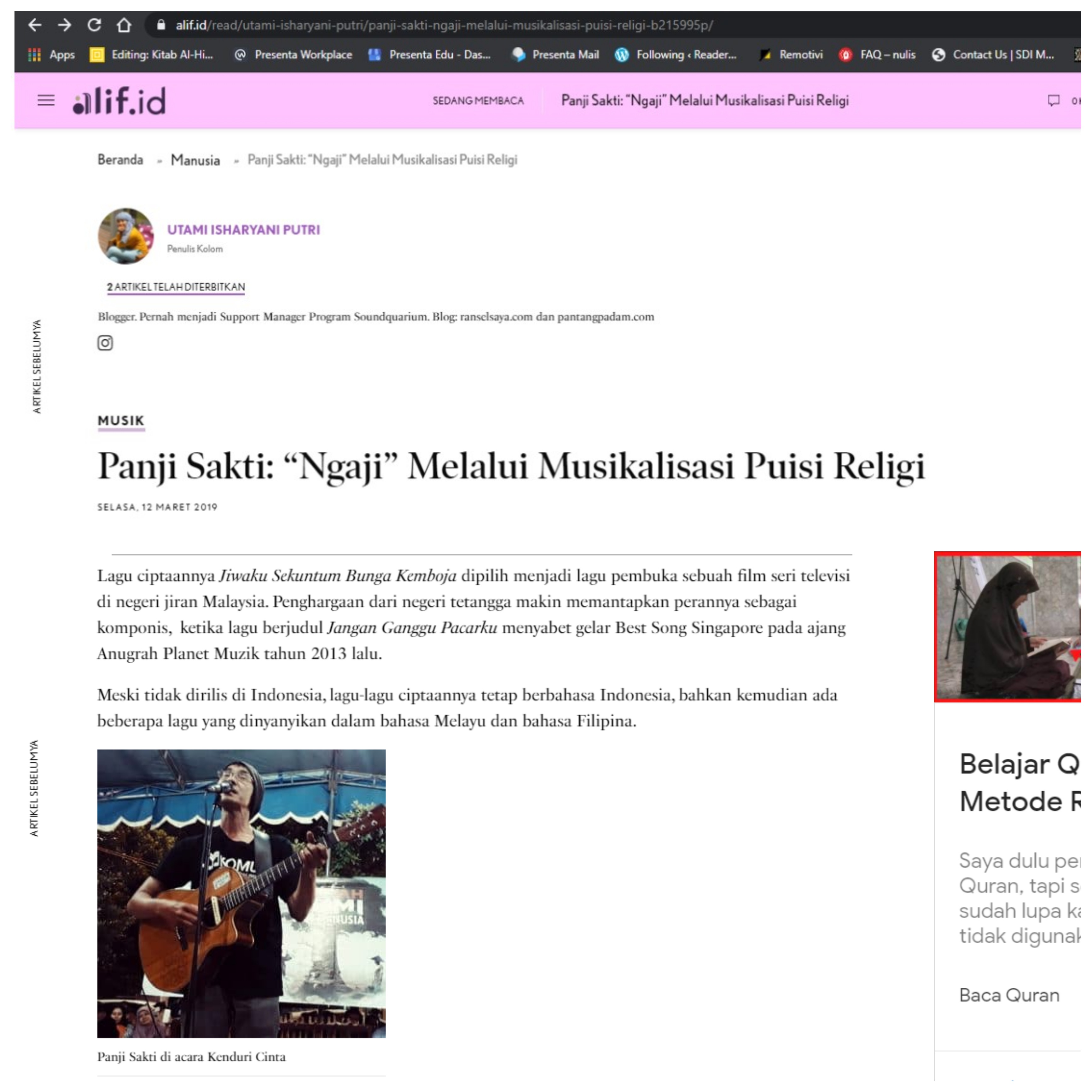 Oh iya, artikel saya di alif.id bisa klik disini >> Panji Sakti: “Ngaji” Melalui Musikalisasi Puisi Religi. (*)