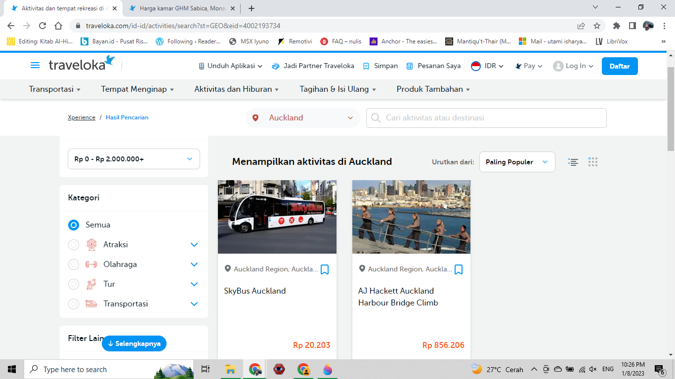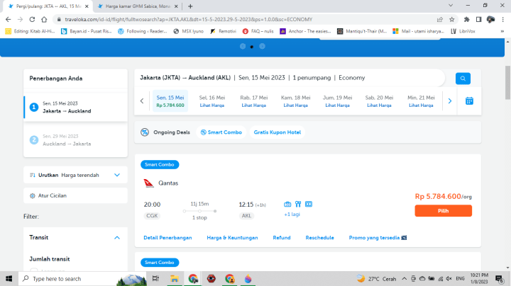 Memilih penerbangan adalah hal yang pertama kali harus dilakukan setelah mengetahui destinasi apa yang diinginkan. Hari ini saya browsing di Traveloka, tiket dari Jakarta ke Auckland sekali berangkat sekitar 5.8 Juta atau sekitar 11.6 Juta Rupiah PP dengan sekali transit di Sydney.