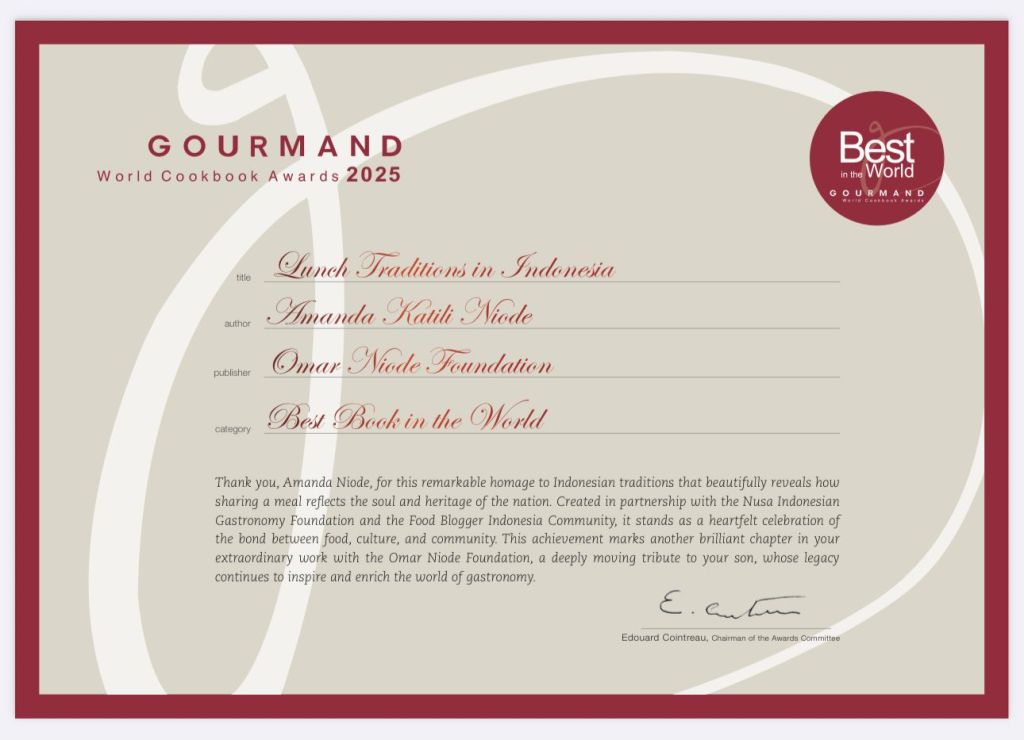Karya ini melesat lebih jauh dari sekadar antologi kuliner. Buku Tradisi Makan Siang Indonesia berhasil meraih penghargaan Best Book in the World untuk kategori publikasi makanan dan minuman dalam ajang Gourmand World Cookbook Awards 2025.